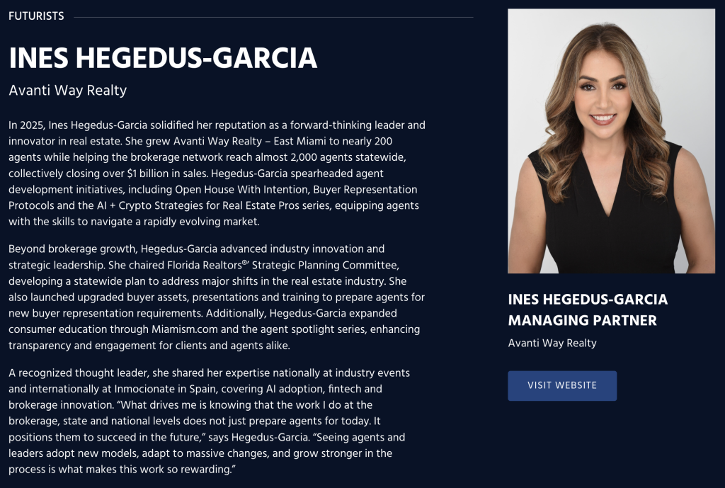 In 2025, Ines Hegedus-Garcia solidified her reputation as a forward-thinking leader and innovator in real estate. She grew Avanti Way Realty – East Miami to nearly 200 agents while helping the brokerage network reach almost 2,000 agents statewide, collectively closing over $1 billion in sales. Hegedus-Garcia spearheaded agent development initiatives, including Open House With Intention, Buyer Representation Protocols and the AI + Crypto Strategies for Real Estate Pros series, equipping agents with the skills to navigate a rapidly evolving market.